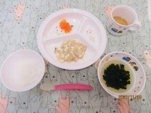 ツナと白菜の和風サラダが食べられて、嬉しそうに保育士へお皿を見せているところでした。