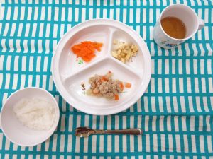 (写真は離乳食後期です。年齢によって盛り付け量を変えて提供しています。)