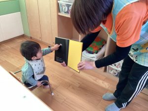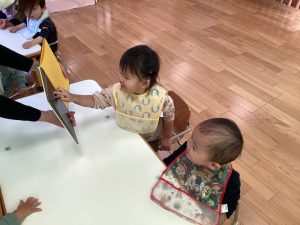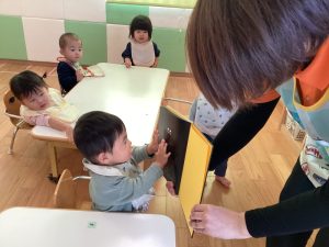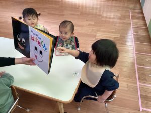 今週の絵本ブログはいちご組さんが「ばけばけばけばけ ばけたくん」の絵本を見ている様子をお伝えします😊