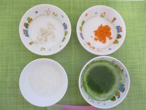 粥 野菜スープ(小松菜) 白身魚のつぶし煮 人参ペースト