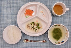 (写真は普通食です。年齢によって盛り付け量を変えて、提供しています。)