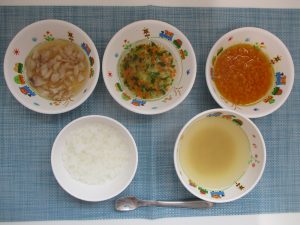 (写真は離乳食後期です。年齢によって盛り付け量を変えて提供しています。)