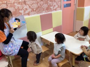 今週の絵本ブログはりんご組さんが5月の月刊絵本「こんばんは こんばんは」の絵本を見ている様子をお伝えします☺️