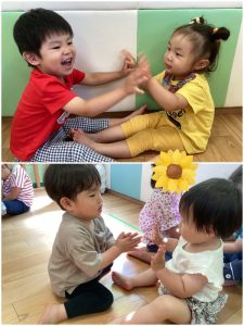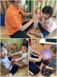 お歌が終わったら三拍子のリズム【トンパッパ】をお友だちと手を合わせてリズムをとっていきます🎵