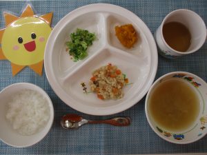 今日は、みんなが大好きなチキンナゲットでした♪おいしかったようで、口の中にたくさんほおばっている姿がとてもかわいかったです(^^)そして、よく噛んで食べることもできました!!