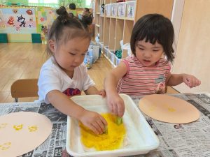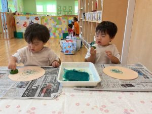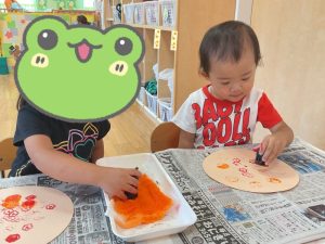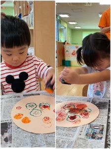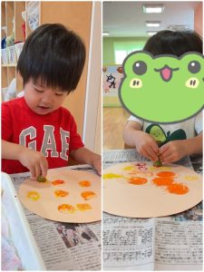ピーマン🫑、オクラ、ナス🍆、小松菜🥬を使って野菜スタンプ😊