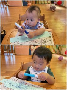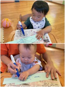 紙いっぱいにダイナミックに描いたり、保育者と一緒に手を動かしたりと初めてになぐりがき楽しんでくれました♡