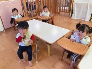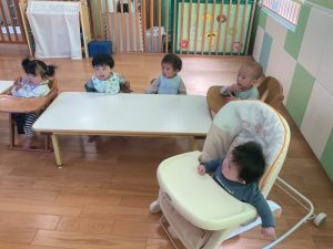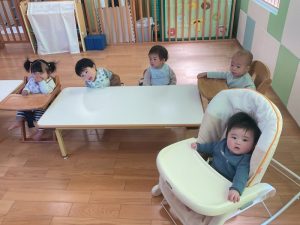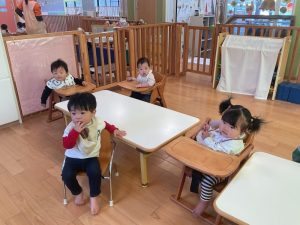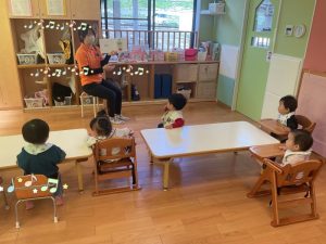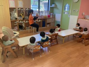 絵本前の手遊びが始まると少し手を動かしたり、保育者の方をじーっと見てくれることが多くなってきたももぐみさんといちごぐみさん🍓🍑