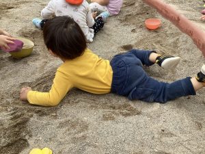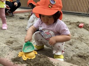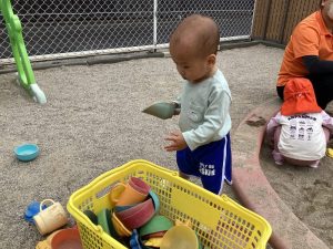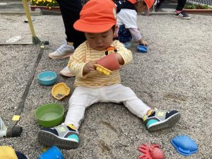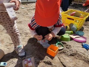 お砂場ではなにを使おっかなーと玩具入れをゴソゴソ🎵