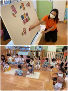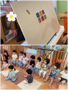 保育者と一緒に手を上げてお返事しましたよ☺️💕
