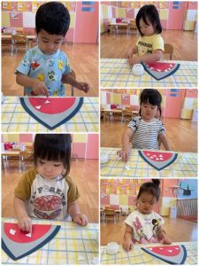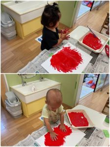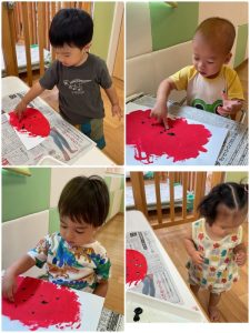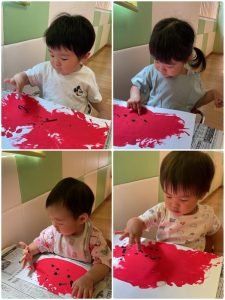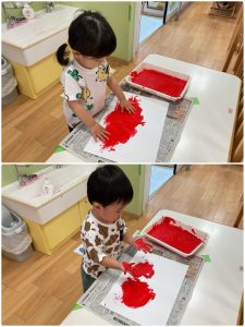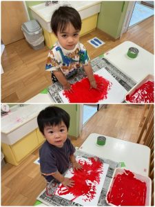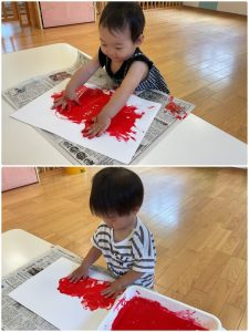 いちご組さんはフィンガーペインティングで画用紙いっぱいの色を塗りました🟥