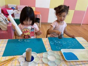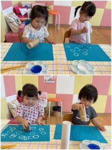 りんご組さんはまあるい廃材を使ってスタンプ⭕️