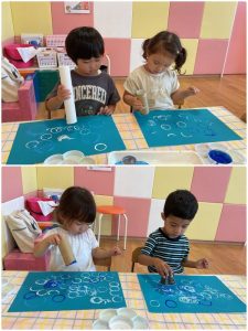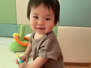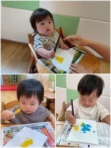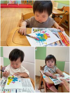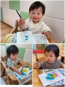 筆にとっても興味津々♡絵の具の場所を握ったり、筆をブンブン振って制作を楽しんでくれたもも組さんです🍑