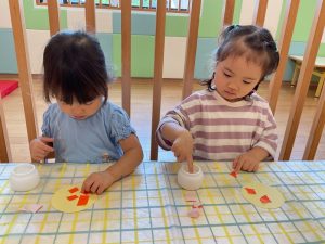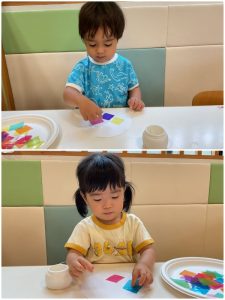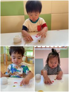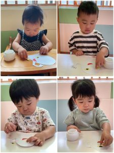 指先にのりをつけて片手で紙を押さえてとっても上手に塗ることができました♡