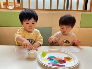 のりをちょんちょんと手に取ったら、カラーセロハンにぬりぬり🎵