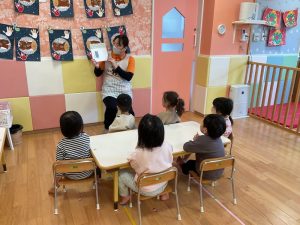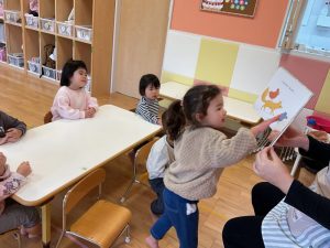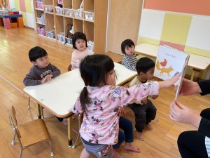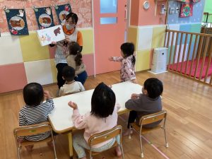 今週の絵本ブログはりんご組さんが「だれのあしあと」を見ている様子をお伝えします☺️