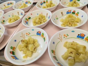 (写真は離乳食後期です。年齢によって形、固さ、盛り付け量を変えて、提供しています。)