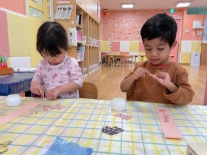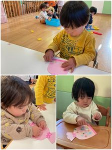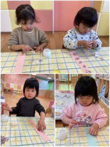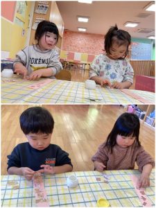 もも組さんはシールをペタペタしてひなあられ作り🎵