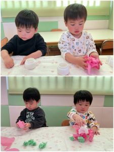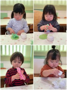 いちご組さんはお花紙を丸めて三色団子作り🍡