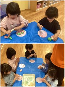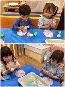 ピンク、みどり、しろに色づいた小麦粉粘土を丸めて三色団子を作ります🍡😋