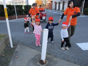 1歳児のお友だちは、先生と手をつないで渡りました。