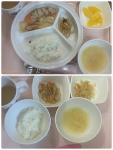 ♪本日のメニュー♬ ご飯・味噌汁・高野豆腐と野菜煮・スパゲティソテー・パイン