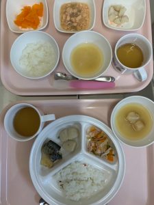 ♪本日のメニュー♬ ご飯・味噌汁・鮭の塩焼き・キャベツの甘酢和え・含め煮