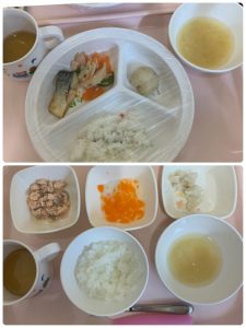 ご飯・味噌汁・サバの味噌煮・野菜炒め・含め煮