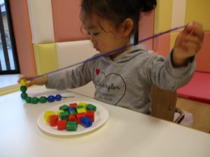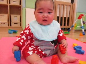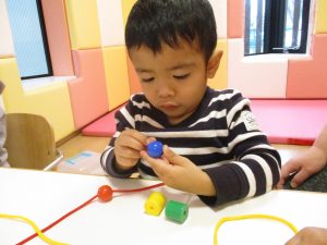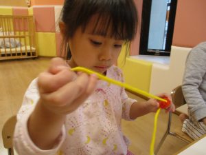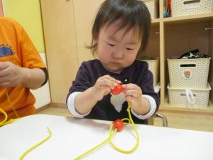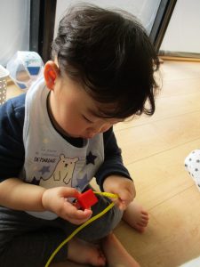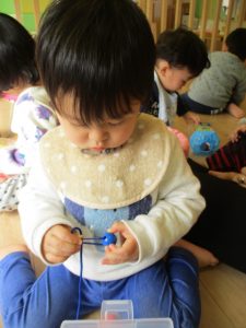 0歳児さんもひも通しにチャレンジ!!