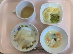 ♪本日のメニュー♬ 食パン・チキンクリームシチュー・混ぜ混ぜサラダ・チーズ・バナナ