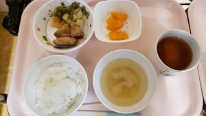 ♪本日のメニュー♬ ご飯・味噌汁・チキンソテー・含め煮・みかん