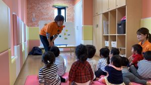 保育者のお話しに興味津々のこどもたち
