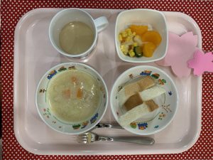 ♪本日のメニュー♬ 食パン・クリームシチュー・キャベツのみそドレサラダ・みかん缶