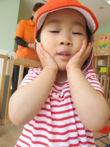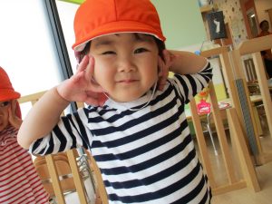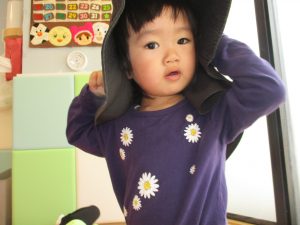 なぜか保育者の帽子をかぶって準備している1歳児さん![]()