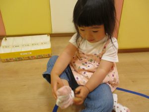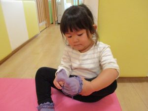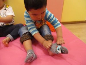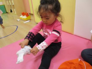 自分で靴下を履いて準備している2歳児さんたち