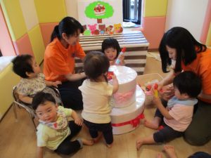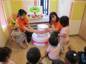 2歳児さんたちは、おおきなケーキをみんなで運んで