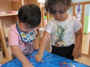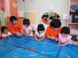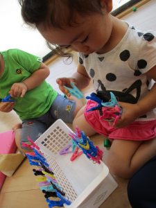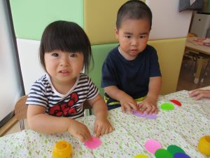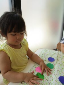 2歳児さんは保育士の話を聞いてからのりを貼りました。