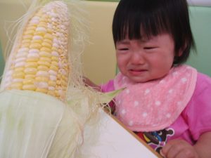 初めてそのままのとうもろこしを見て泣いてしまう子。