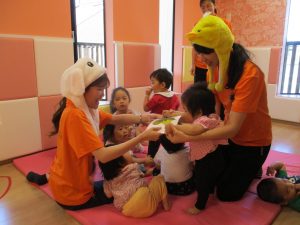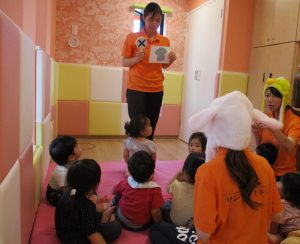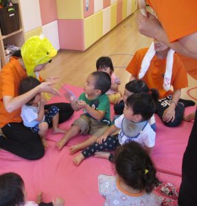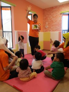 子どもたちは目を輝かせて保育士のお話をよ~く聞いています(^^)