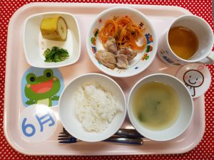 ♪本日のメニュー♬ ご飯・味噌汁・鶏肉のみそ焼き・スパゲティソテー・きゅうりのゆかり和え・バナナ