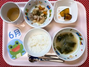 ♪本日のメニュー♬ ご飯、味噌汁、五目豆、かぼちゃの素揚げ