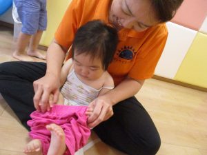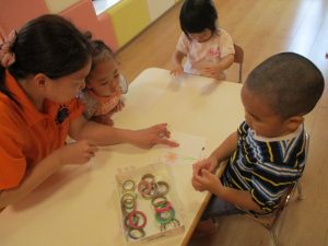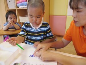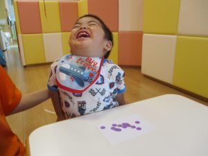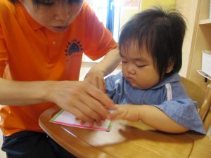 1歳児さんたちは紫色や緑色の丸シールを貼って