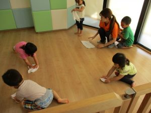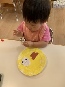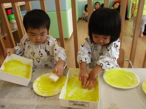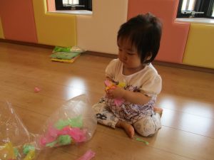 楽しそうに花紙をにぎにぎしている保育者をみて真似っこします❗