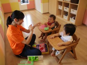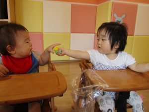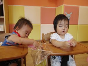 入園したばかりの0歳児さん二人もすっかり園に慣れて楽しく遊ぶことができます?