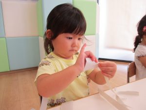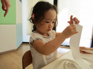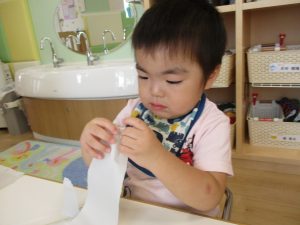 2歳児さんは、線を頼りに少しずつビリビリ?