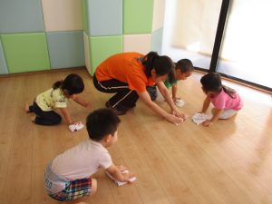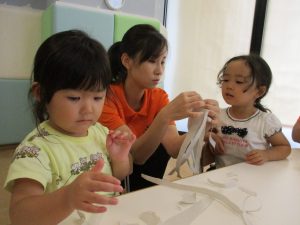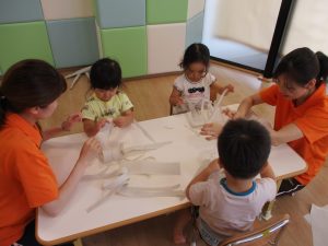 保育者と一緒にたくさん花紙を丸めた子どもたち