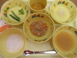 粥 味噌汁 そぼろ煮 スティックきゅうり 梨すりおろし