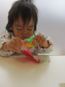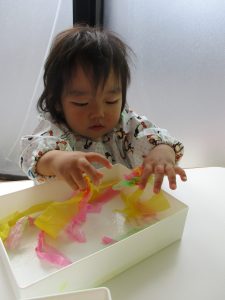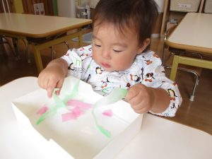 0歳児さんは花紙をクシャクシャ、ビリビリ~