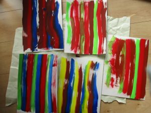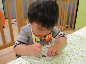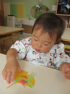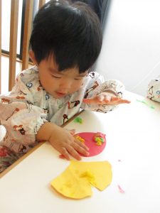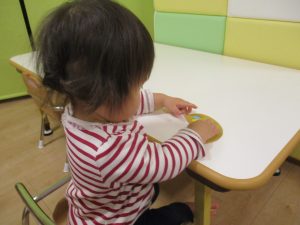 2歳児さんはスポンジ絵の具に挑戦!!