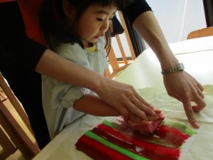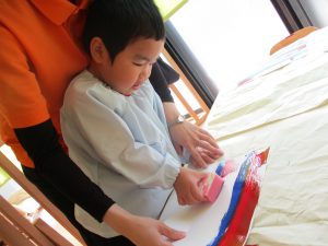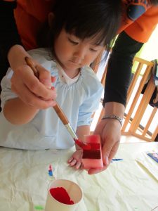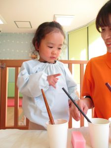 保育者と一緒にスポンジに塗りました!